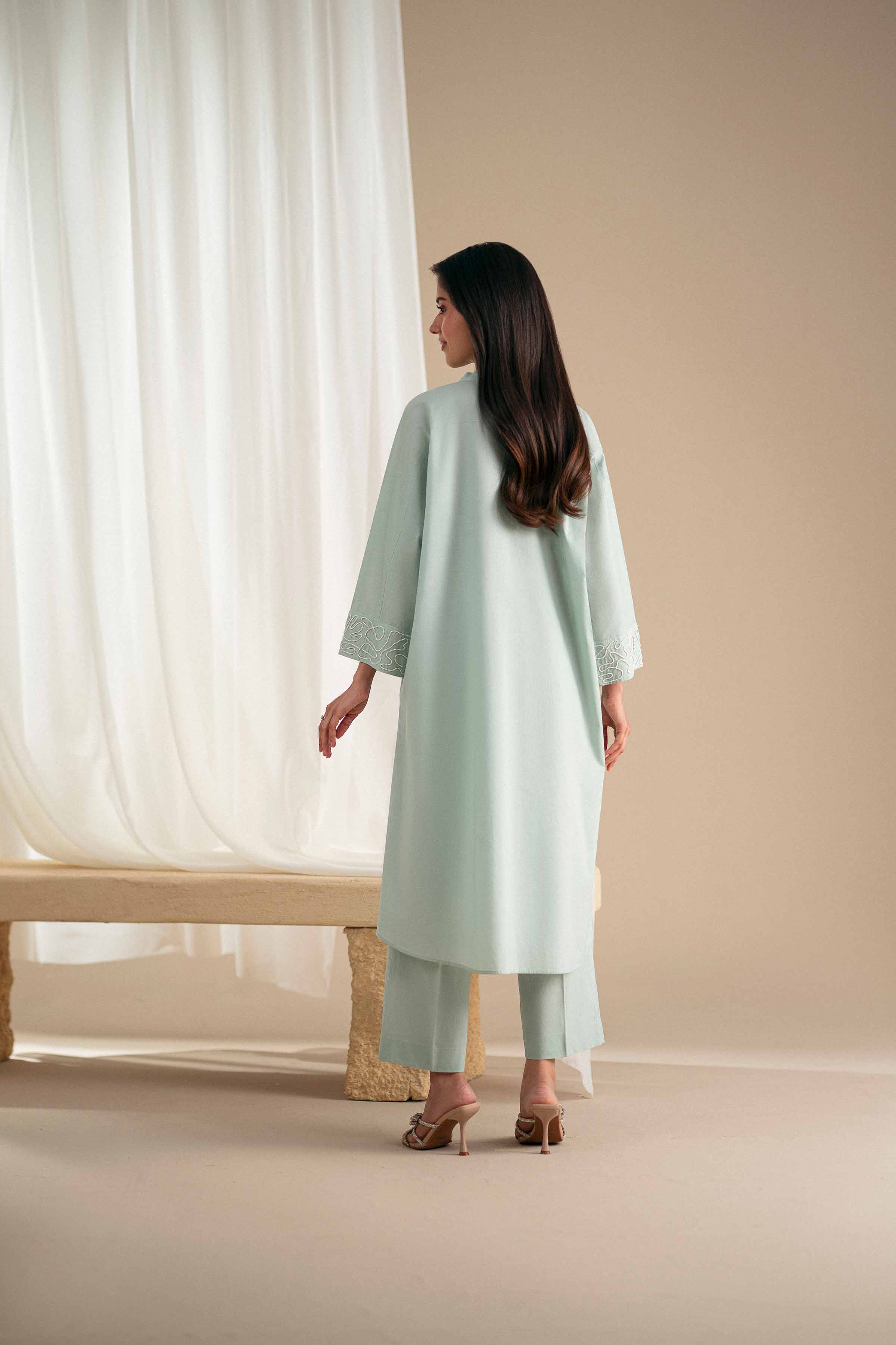 Long box-pleated kimono shirt featuring a band neckline with mirror work detailing on the placket and cuffed sleeves.